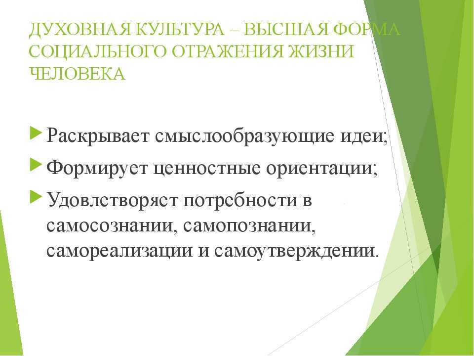 Всё это примеры проявления духовной культуры человека. К духовной культуре также относится и эстетическая направленность, например, мировая художественная культура.
