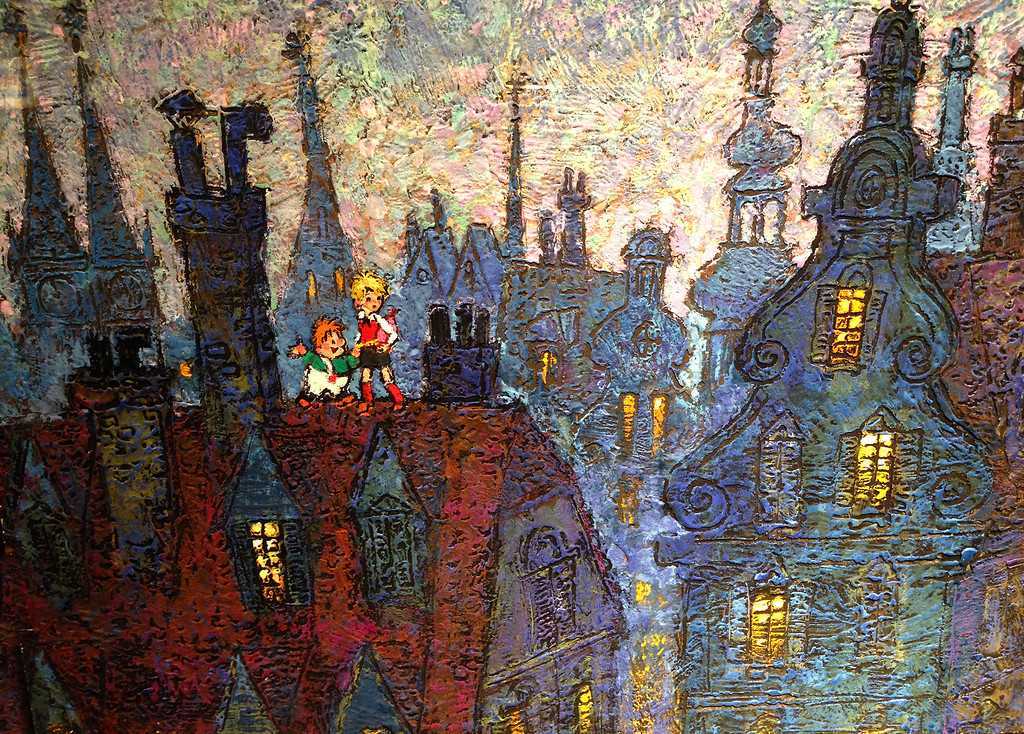 Карлсону прекрасно живётся в маленьком домике на крыше. По вечерам он сидит на крылечке, покуривает трубку да глядит на звёзды. С крыши, разумеется, звёзды видны лучше, чем из окон, и поэтому можно только удивляться, что так мало людей живёт на крышах. Должно быть, другие жильцы просто не догадываются поселиться на крыше. Ведь они не знают, что у Карлсона там свой домик, потому что домик этот спрятан за большой дымовой трубой