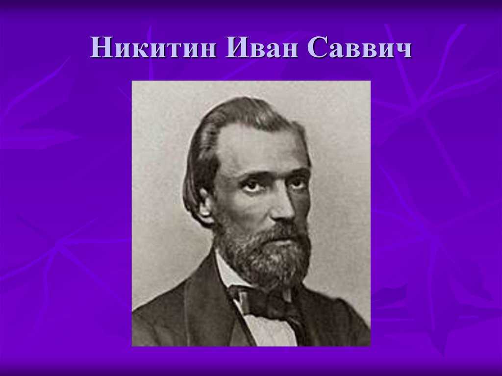 Никитин Иван Саввич — простой русский поэт из глубинки середины 19 века. В его творческой деятельности можно проследить дух того еще времени. Произведения Ивана Никитина оказывает большой интерес у читателей, в частности у тех, кто интересуется глубокой поэзией. Иван Саввич родом из города Воронеж. Родился в 1824 года в достаточно зажиточной семье. Его отец торговал свечами и был мещанином. В детстве поэт очень любил читать, часто уходил на реку и там проводил время с любимой книгой. Грамоте его научил местный сосед – сапожник. В возрасте приблизительно 9 лет, Иван Никитин поступил сначала в местное духовное училище, а уже позже в семинарию. Но, к сожалению учебу пришлось прервать, в связи со смертью матери и разорением отца. В те годы будущий поэт взял всю заботу о близких на себя. Ему пришлось оставить учебу, в связи с большим количеством пропусков и помогать отцу. Дальше жизнь Ивана Никитина становилась труднее, ему пришлось работать дворником. Но, не смотря на достаточно тяжелую работу, Никитин не опустился в духовном плане. И всякий раз, когда выдавалась свободная минутка – читал любимую книгу, и пробовал самостоятельно писать стихи. Первые строки поэта состоялись в 1853 году. Их опубликовали в местных ведомостях. На этом момент поэту было около 29 лет. После успешной публикации, стихи начали переписываться и даже передаваться из рук в руки. Далее стихи были произведены в «Отечественных записках», «Библиотеке для чтения». Иван Никитин очень любил воспевать красоту русской природы, замечать ее оттенки и чувствовать мир. Так же в своих произведениях Иван Никитин любил описывать жизнь простолюдина. К примеру – «Жена ямщика», «Пахарь» и другие. В своих стихах автор повествует огромную любовь к народу и глубокое сочувствие к сложной судьбе. В своих произведениях Иван Саввич писал все как есть, не старался приукрасить. От жизни простолюдина поэт был вовсе далек, поэтому все сведения приходилось получать от людей, которые останавливались на его постоялом дворе. Вскоре будущий поэт познакомился с Толстым Д.Н. Позже он помог Ивану Никитину напечатать стихотворения и ввел его в круг местной интеллигенции. К слову сказать, не смотря на все успехи в творческой деятельности, поэт жил довольно тяжело. Его отец начал пить, семейные дела тоже ухудшились. А вскоре и Сам Никитин тяжело заболел и долго не мог выздороветь. Именно в эти минуты к поэту пришла вера, и он стал писать на религиозные темы. Поэт все так же искренне воспевал красоту русской природы. Многие его стихи со временем превратились в песни и романсы. В последние годы жизни поэт очень часто болел, но продолжал заниматься творческой деятельностью. В это время вышло очередное произведение. Принимал активное участие в культурной деятельности города Воронеж, проводил занятия в школах. 28 октября 1861 года от чахотки скоропостижно скончался поэт Иван Саввич Никитин. На момент смерти ему было всего 37 лет. За время жизни он написал более 200 стихотворений, 3 поэмы и 1 повесть.