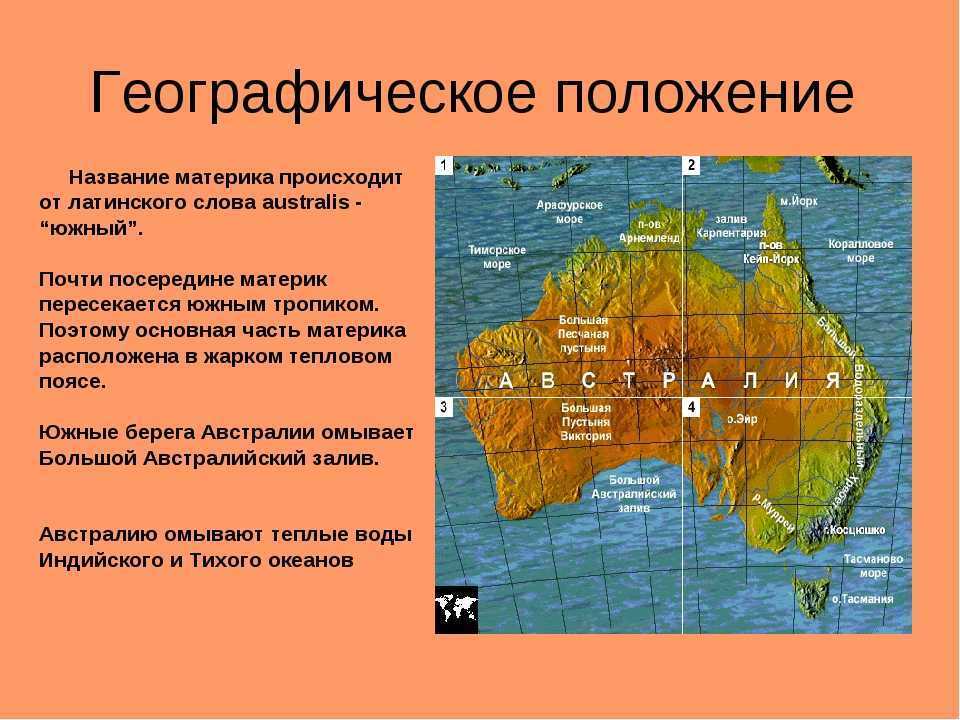 Главной особенностью географического положения Австралии является её удалённость от других материков нашей планеты. Австралия полностью расположена в Южном и Восточном полушариях Земли. Почти посередине её пересекает Южный тропик.