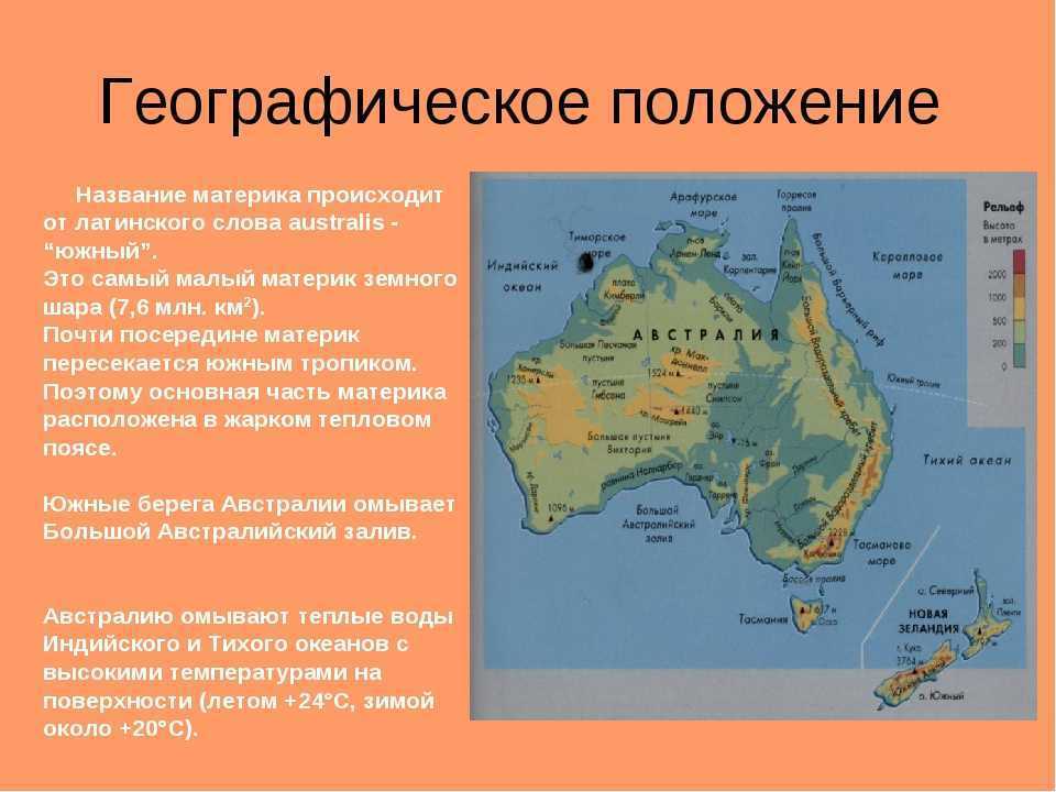 Этот материк-государство омывается водами двух океанов – восточное побережье омывает Тихий океан, а западное побережье – Индийский. Страна полностью лежит в южном полушарии относительно экватора и в восточном полушарии относительно нулевого меридиана.