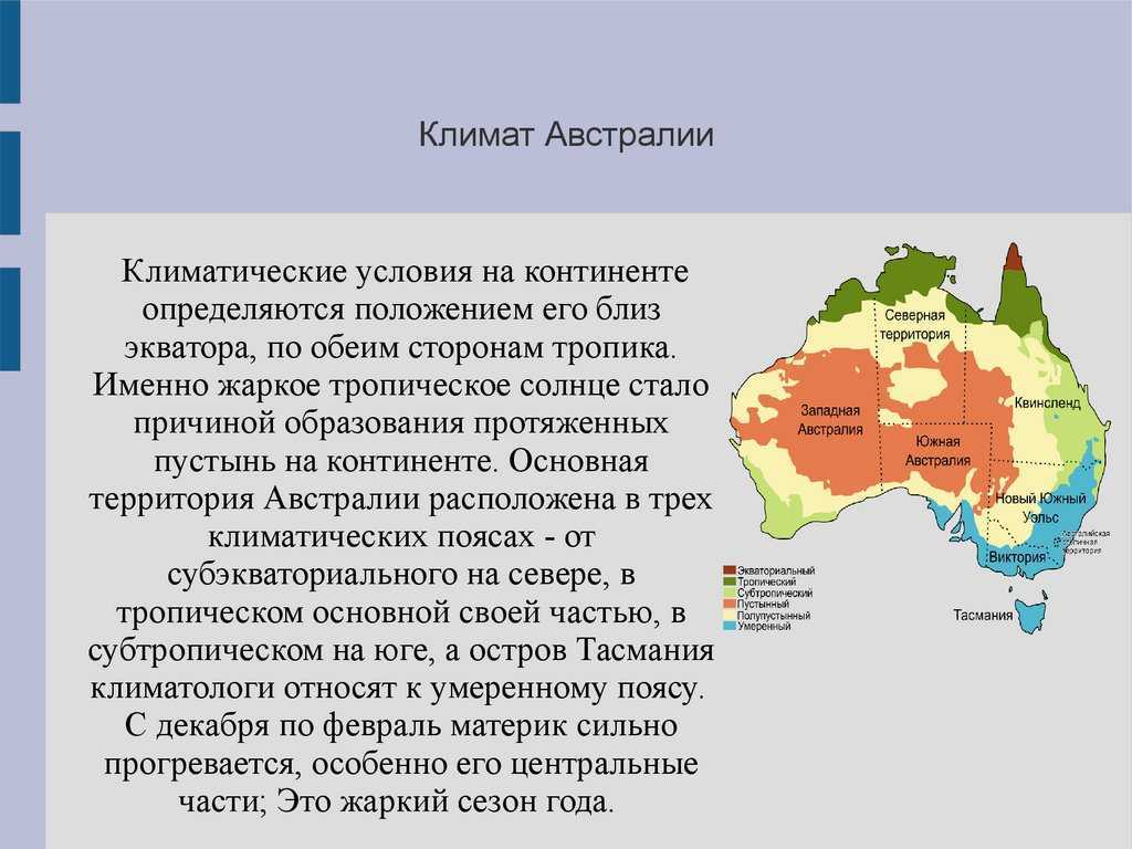 Недра Австралии богаты углём, железными, алюминиевыми, медными, никелевыми, полиметаллическими, титановыми, урановыми рудами, золотом, алмазами, благородным опалом.Из-за того, что Австралия расположена в Южном полушарии, самым тёплым месяцем в Австралии является январь, а самым холодным — июль. На севере Австралии находится субэкваториальный пояс, для которого характерны жаркое и влажное лето (декабрь — февраль) и жаркая и сухая зима (июнь-август). Большую часть материка занимает тропический климатический пояс. Причём в центральных и западных районах Австралии преобладает жаркий (+24°С) сухой (менее 250 мм осадков) тропический климат, поэтому значительную часть Австралии занимают пустыни и полупустыни. Именно по этой причине Австралию называют и самым сухим материком нашей планеты. На восточные склоны Большого Водораздельного хребта пассаты приносят большое количество осадков со стороны Тихого океана и в районе города Кэрнс выпадает самое большое на материке количество осадков (более 2000 мм).