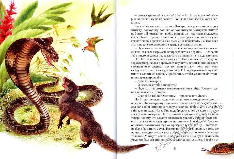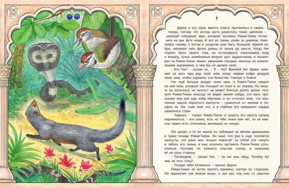 Там прыгая по всем местам, он увидел семью Дарси. Птицы сидели в своем гнезде и рыдали. Когда же мангуст поинтересовался, в чем дело, они рассказали, что злая кобра съела их детеныша. И как только, они произнесли эти слова, зверек увидел жестокого и страшного Нага. Мангуст знал из рассказов мамы, что они, когда вырастут, то охотятся за змеями.
