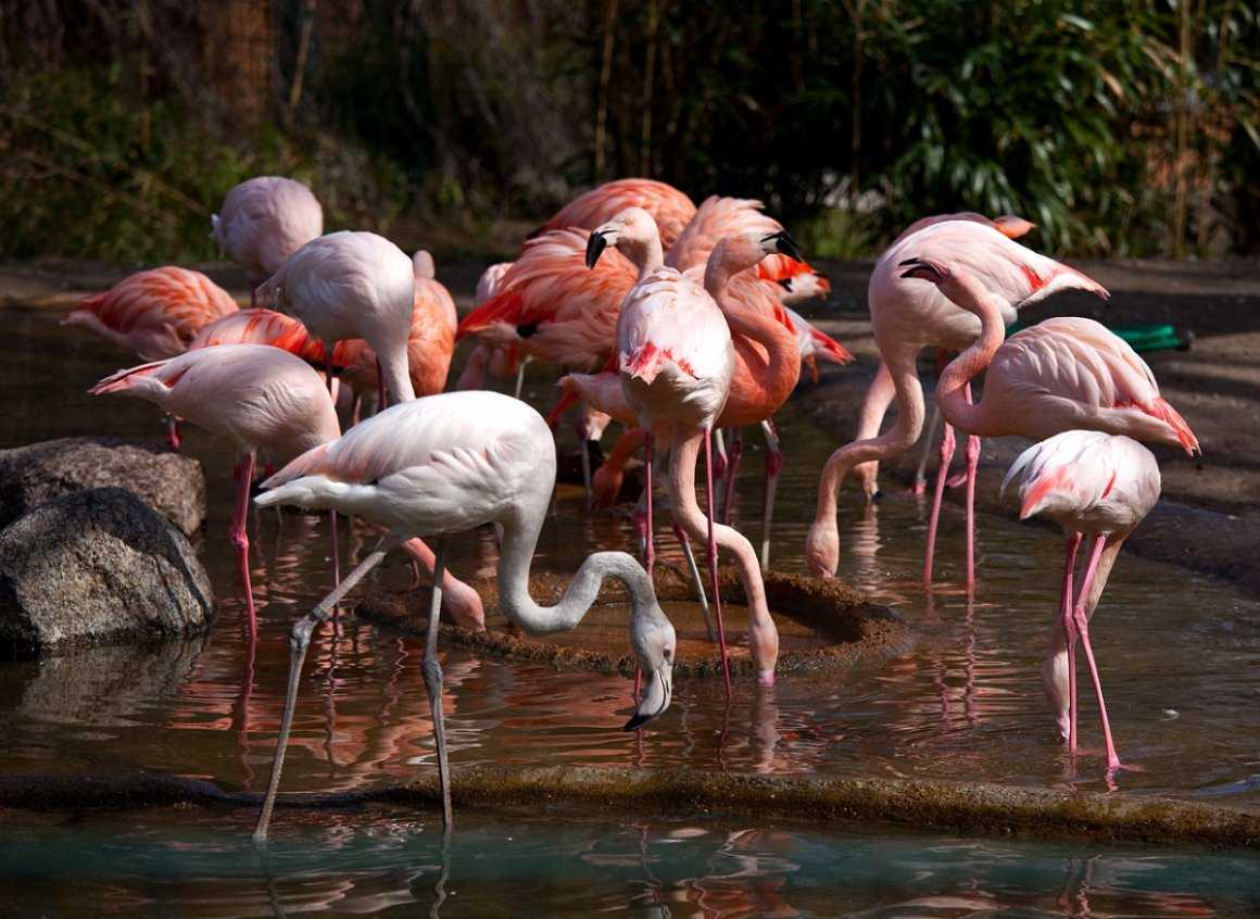 Смотреть на фламинго лучше всего во время кормлений утром и днем. Взрослые птицы с аппетитом съедают лакомство, опуская свой роскошный клюв в воду, а после приема пищи чистят перышки. Птенцы при этом старательно повторяют движения взрослых.
