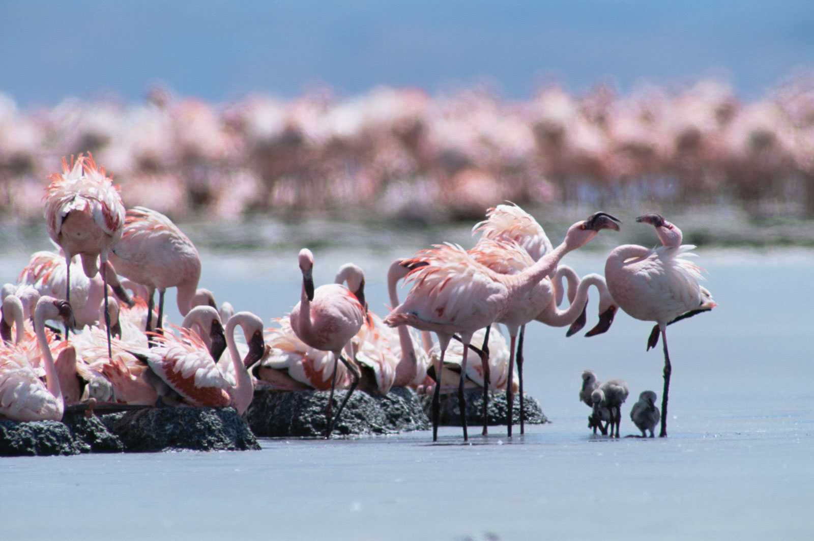 Здесь не водится рыба, но много мелких рачков (артемий) – основной пищи фламинго. От агрессивной среды птиц спасает плотная кожа на ногах и визиты к пресным водоемам, где фламинго смывают соль и утоляют жажду. Кроме того, им не с