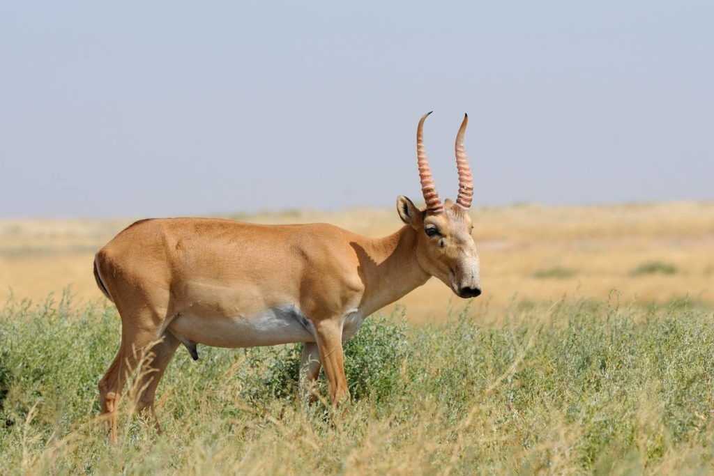 Антилопа с вытянутой горбоносой мордой. Рога небольшие, полупрозрачные, расположены вертикально. Для сайгаков характерна сезонная концентрация особей, когда на наиболее богатых кормом территориях собираются многотысячные стада. Неконтролируемый отстрел и периодические эпизоотии привели к тому, что в настоящее время сайгаки находятся на грани исчезновения.