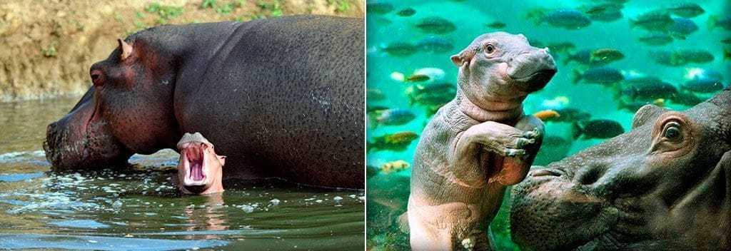Когда на свет появляется детёныш гиппопотама обыкновенного, он весит от двадцати до пятидесяти килограмм, но в основном около 45 кг. Длина его тела небольшая, всего метр, а высота и того меньше – 50-60 сантиметров в плечах. Если роды происходили в водоёме, то мать подталкивает своего детёныша к поверхности и вытягивает на мелководье, иначе тот задохнётся. На протяжении десяти минут малыш приходит в себя, а после уже твёрдо стоит на ногах и может даже самостоятельно передвигаться.