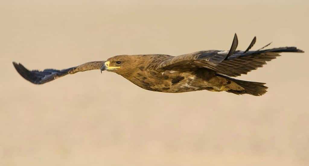 - Степные орлы (Аquilа niраlеnsis) – хищники длиной 60-85 см, при размахе крыльев на уровне 220-230 см и среднем весе в пределах 2,7-4,8 кг. Окрас оперения взрослых птиц представлен тёмно-бурым цветом, часто с наличием рыжеватого пятна в области затылка и чёрно-бурых первостепенных маховых перьев. Рулевое перо тёмно-буроватое, с сероватыми поперечными полосками;