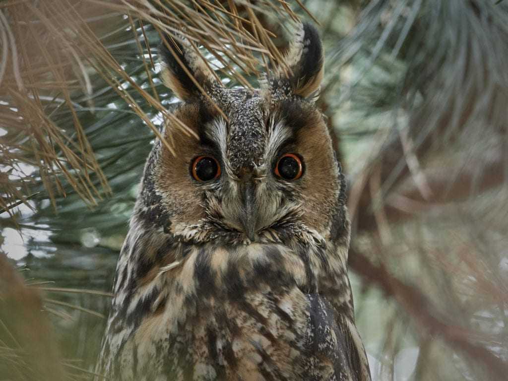 Ушастая сова, согласно своему названию, имеет на голове два пучка перьев. Окрас оперения – серо-бурый, с пестрыми пятнами. Селится она, в основном, в хвойных лесах, отыскивая брошенные другими птицами гнезда. Питается полевыми мышами, но во время ухода за потомством может охотиться и на птиц. Характер у этой птицы спокойный, других обитателей леса она особо не тревожит, предпочитая надежно скрываться в своем гнезде.
