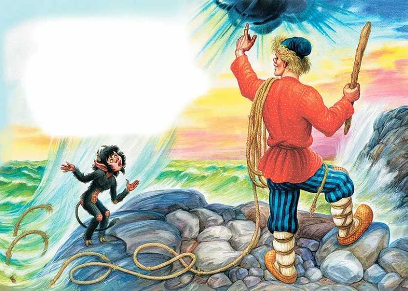 Пошел, сел у берега моря; Там он стал веревку крутить Да конец ее в море мочить. Вот из моря вылез старый Бес: «Зачем ты. Балда, к нам залез?»