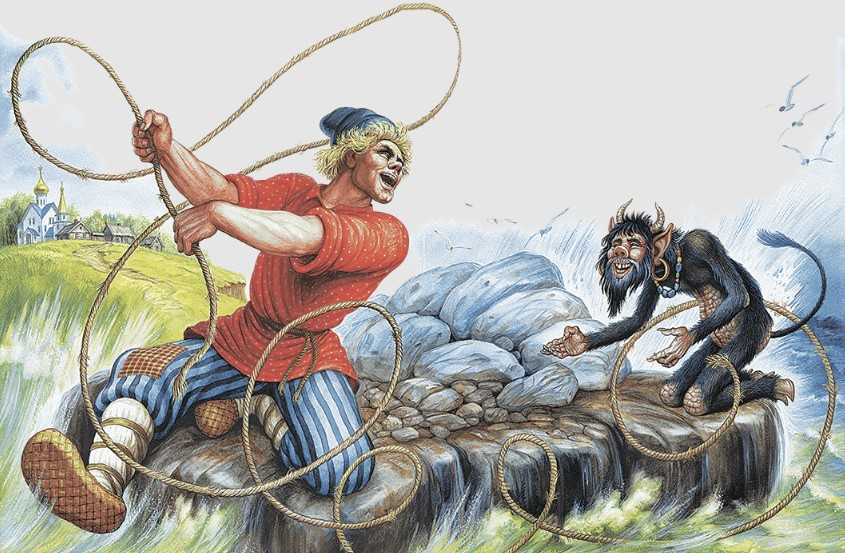 От такой идеи поп повеселел и посмелел, ясное дело никому не захотелось бы такое перетерпеть. Он позвал к себе Балду и приказал ему пойти и забрать у чертей оброк, который они задолжали ему за три года. Поповский работник на такое согласился и сразу же пошел к морю. Он сел на берегу, один конец веревки кинул в воду, а другой конец стал крутить в руках.
