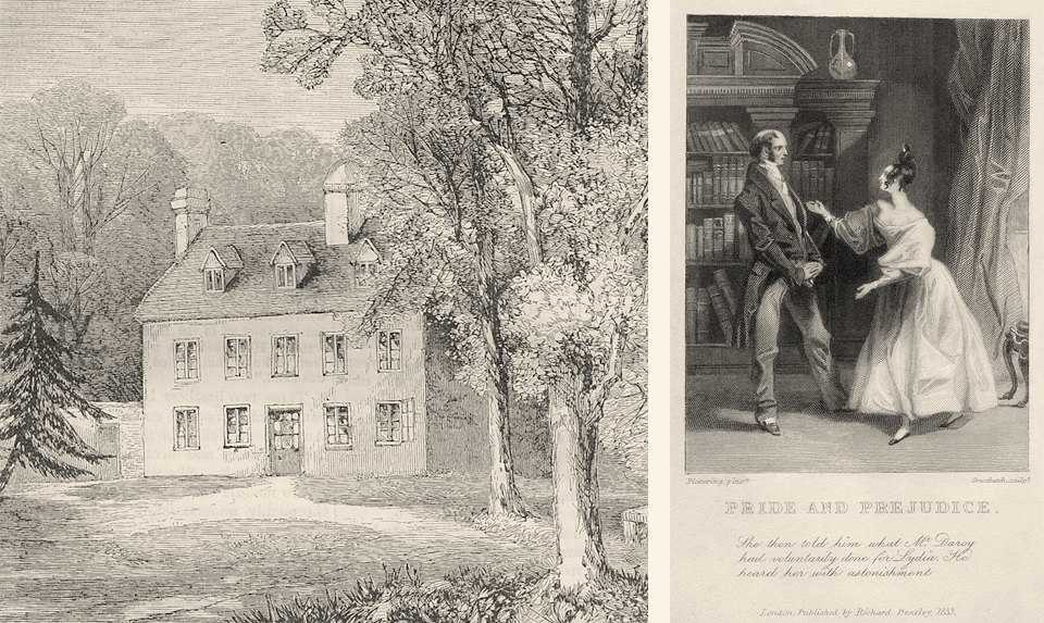 Слева направо: дом писательницы в Стивентоне; первая иллюстрация к «Гордости и предубеждению», напечатанная в издании 1830 года