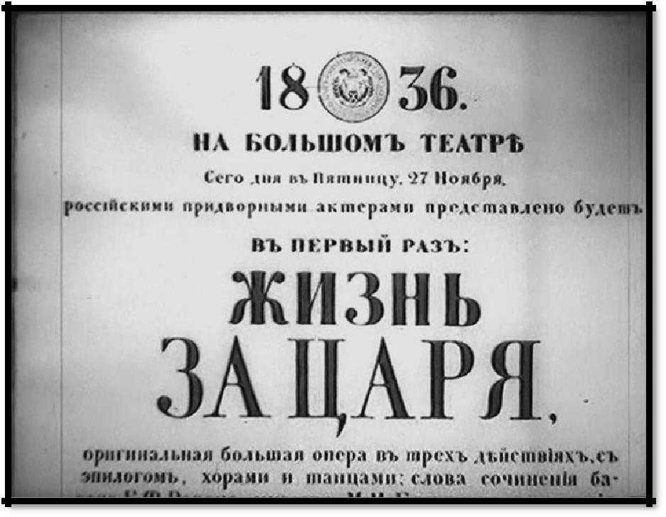 - 1836 – Михаил Глинка представил публике оперу в 4 актах «Жизнь за царя», о событиях, произошедших в 1613 году. Либретто к опере было написано бароном Розеном.