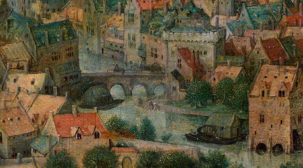 Слева – подъёмный кран 16 века. Справа – часть города позади вавилонской башни. По мосту едет телега, женщины полоскают белье.