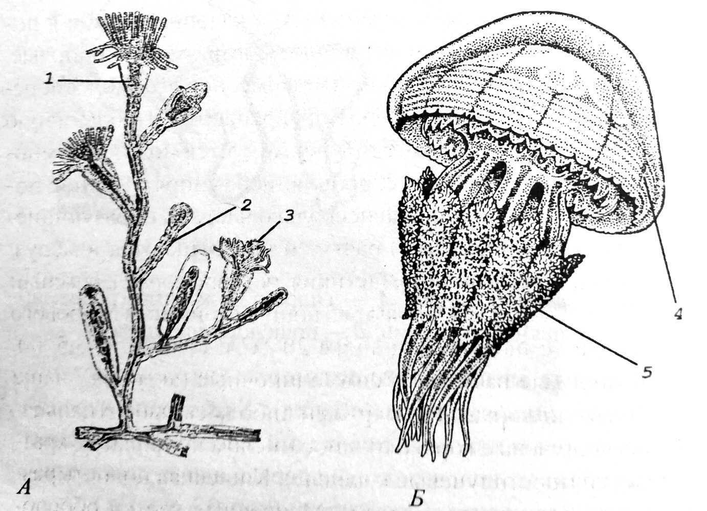 Внешнее строение гидроида и сцифомедузы: А — гидроид обелия; Б — медуза корнерот; 1 — гидрант; 2 — почка; 3 — щупальца; 4 — зонтик; 5 — ротовые лопасти.