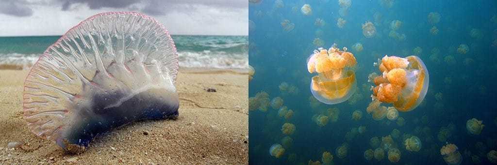 Слева Физалия (Physalia aretusa) -колония полипов, справа медуза