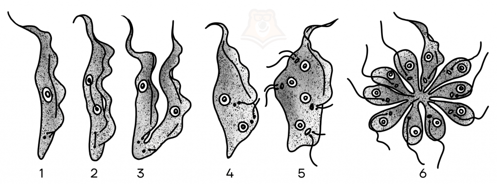 Бесполое размножение трипаносомы: 1-3 – бинарное деление, 4-6 – шизогония