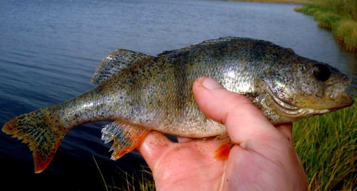 - Желтый окунь. Некрупная рыба, у которой нижние плавники и светлые полосы на боках имеют золотистый окрас.