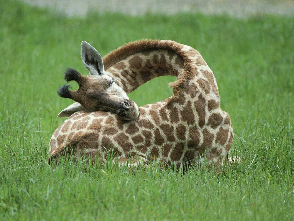 Для того, чтобы набраться сил и поспать, жираф укладывается на землю, и размещает свою голову на туловище (эта поза характерна для стадии «глубокого сна», в сутки она длится примерно 20 минут). Находясь в полудреме днем, животное компенсирует недостаток сна.