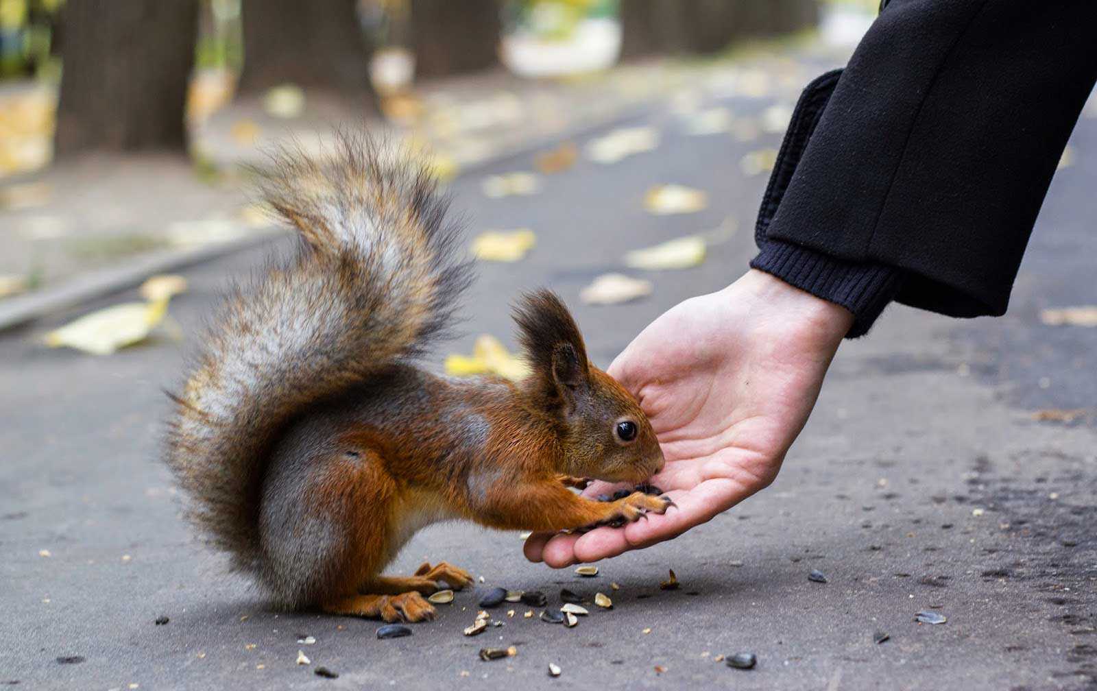 Очень часто в городских парках белки едят с рук человека. В основном белок подкармливают орехами. В домашних условиях белок кормят также орехами, зерновыми, различными ягодами или сухофруктами, грибами. Корм для домашнего содержания животного должен максимально походить на их рацион в дикой природе.