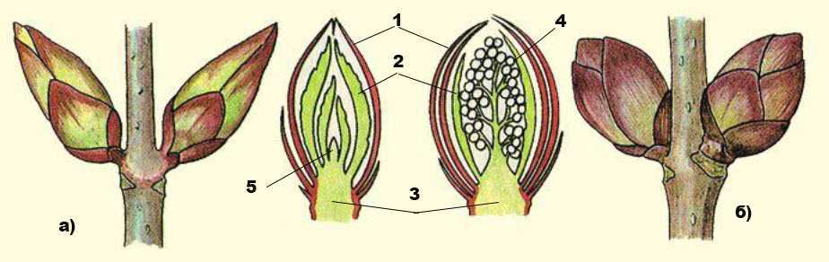 Рис.2 Строение вегетативной (а) и генеративной (цветочной) (б) почек: 1 – почечные чешуи; 2- зачаточные листья; 3 – зачаточный стебель; 4 – зачаточный цветок или соцветие; 5 – точка роста