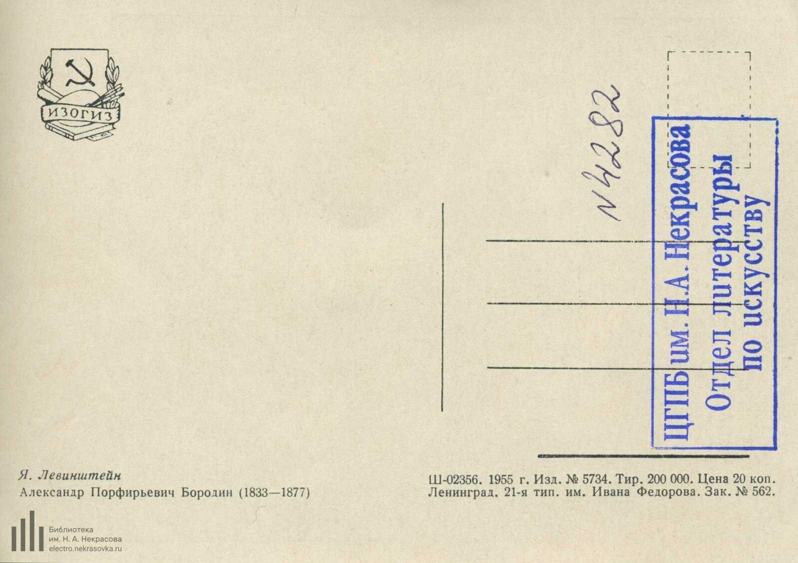 А. П. Бородин на немаркированной почтовой карточке СССР 1955 года. Картина художника Я. Левинштейна.