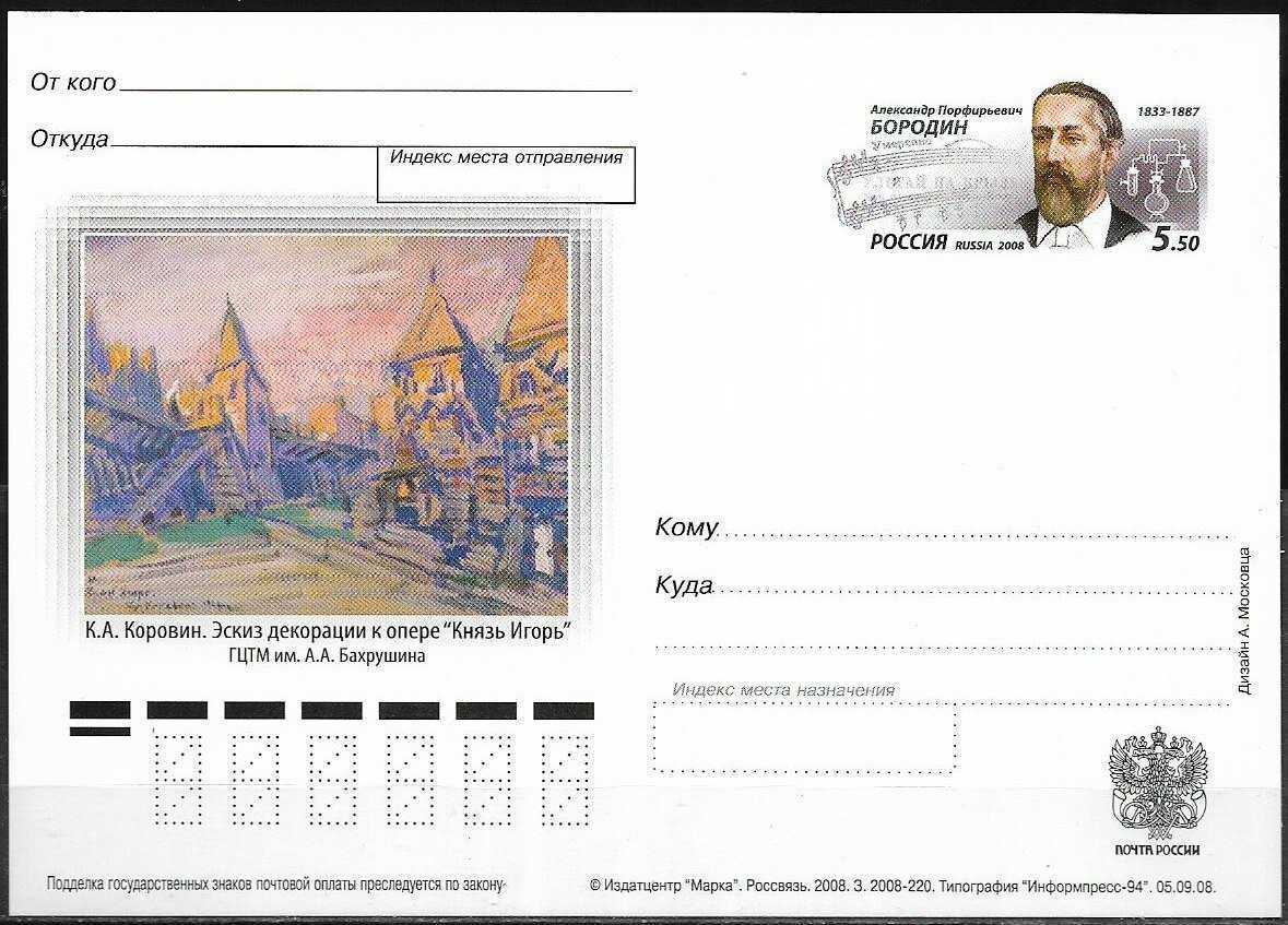 Россия. Почтовая карточка с оригинальной маркой 2008 года. № 191. 175 лет со дня рождения А. П. Бородина