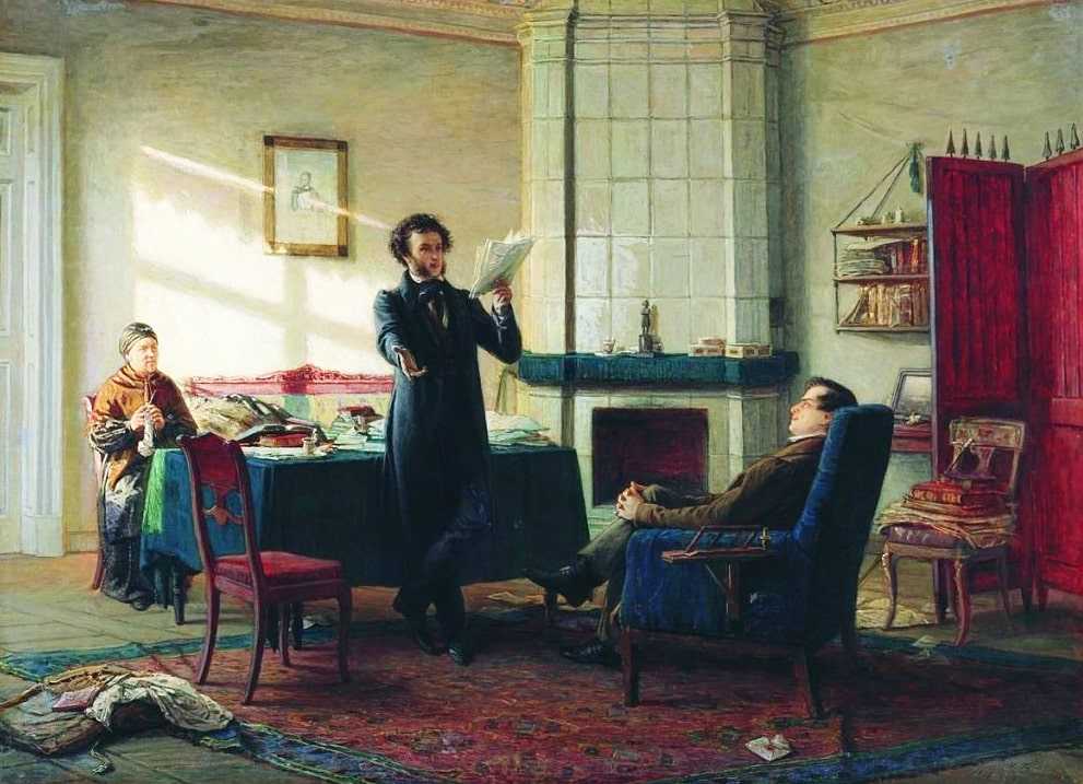 Пушкин читает стихи другу Пущину, который приехал к нему в гости в село Михайловское