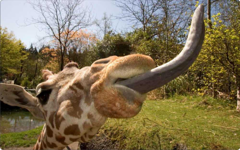 - Жирафы имеют очень длинный язык. Взрослые особи способны высовывать его из пасти почти на 50 см. Кроме того, он имеет большое количество мышц и очень подвижен.