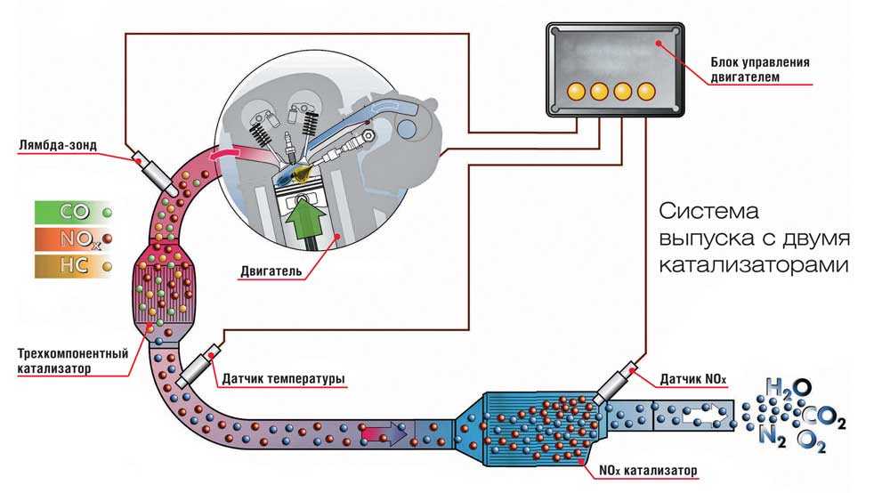 - Во втором – добавляется сложная способность устройства работать с окислами азота. Особенно много их образуется в современных дизельных и бензиновых моторах, в силу повышения экономичности, которых конструкторам приходится использовать обеднённые и бедные смеси на впуске.