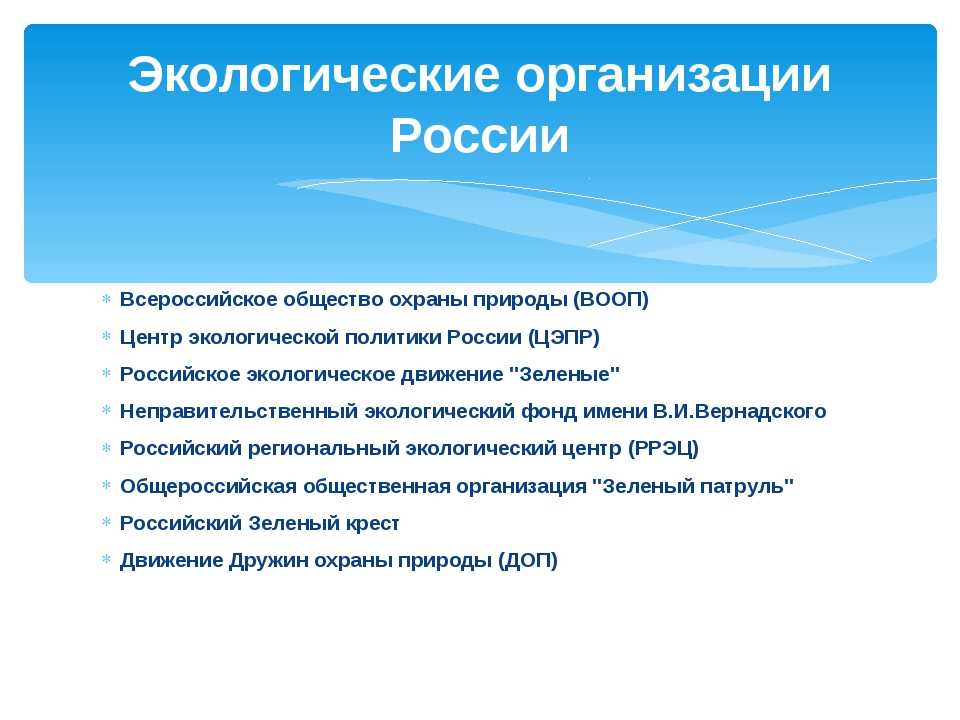 Всероссийское общество охраны природы Целью общества является сохранение окружающей среды, сохранение разнообразия животного и растительного мира, а также сохранение и укрепление здоровья населения. 2. Центр экологической политики России (ЦЭПР). Целью Центра является экспертная поддержка экологического движения и разработка рекомендаций для законодательной и исполнительной власти. 3. Российское «зеленое» экологическое движение. Целью Движения является изменение отношения государства и общества к экологическим проблемам России и человечества в целом посредством организованных и целенаправленных политических действий. 4. Гринпис Россиинпис (Гринпис) Росси и цель Организации — способствовать сохранению последних уголков незагрязненной природы, борьбе с ядерной опасностью, стремлению устранить угрозы, вызванные химическим и генетическим загрязнением. Экологические организации России