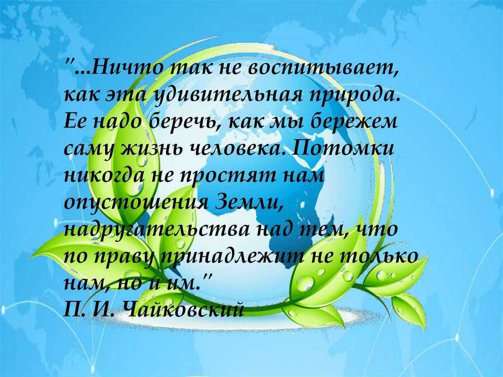 Давно ушли в прошлое времена, когда люди использовали природные ресурсы Земли, не задумываясь о негативных последствиях своей деятельности. Сейчас всё больше людей понимает, что само существование цивилизации зависит от того, сумеет ли человек сохранить природу, сохранить окружающую его среду.