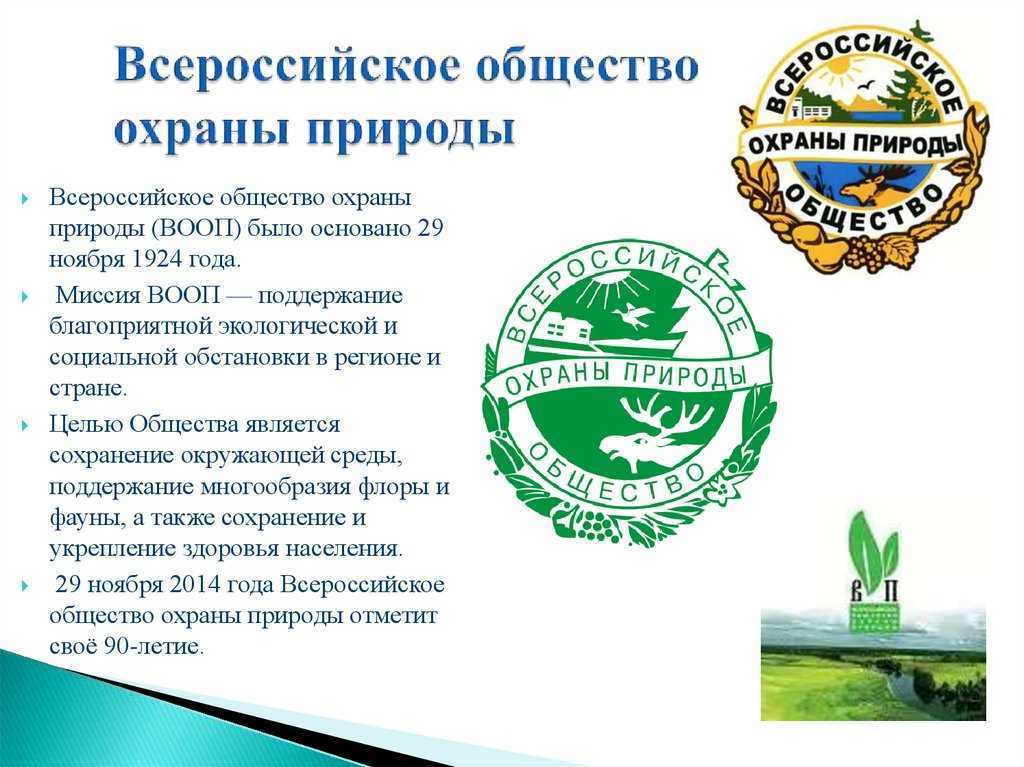 Всероссийское общество охраны природы основано в 1924 г. для стабилизации экологической обстановки в стране. ВООП в тандеме с госорганами проводит контроль деятельности предприятий на факт соблюдения природоохранного законодательства. Отделения учреждения открыты во всех субъектах РФ.
