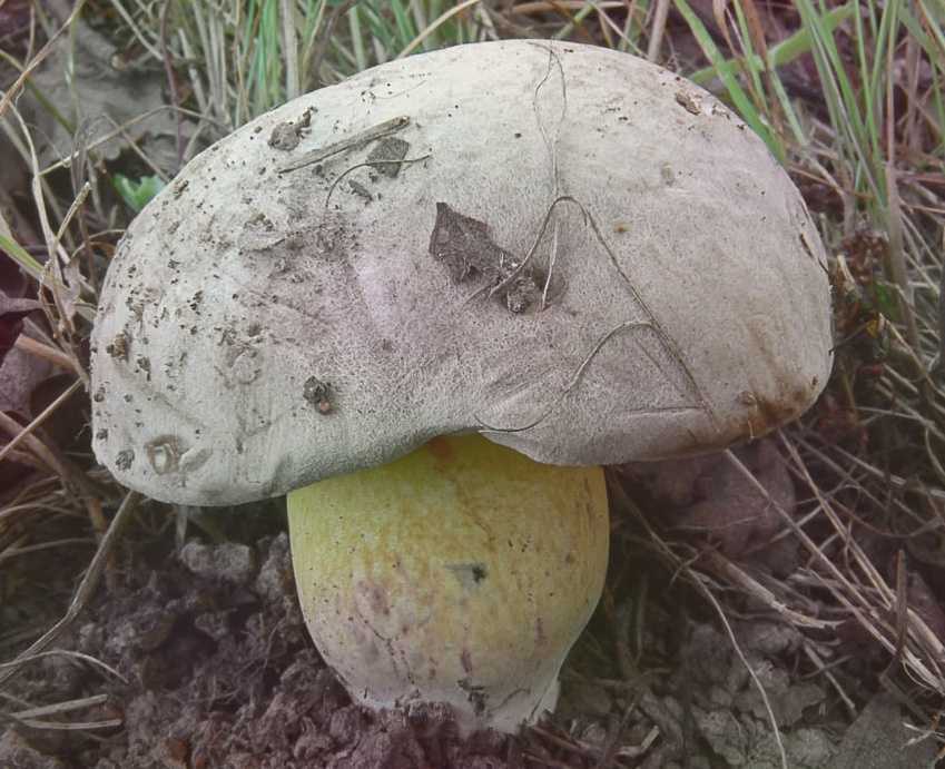 Шляпка крупная, подушковидной формы, диаметром до 30 см. Кожица шляпки гладкая и сухая, светлая с сероватым оттенком, синеющая при надавливании.