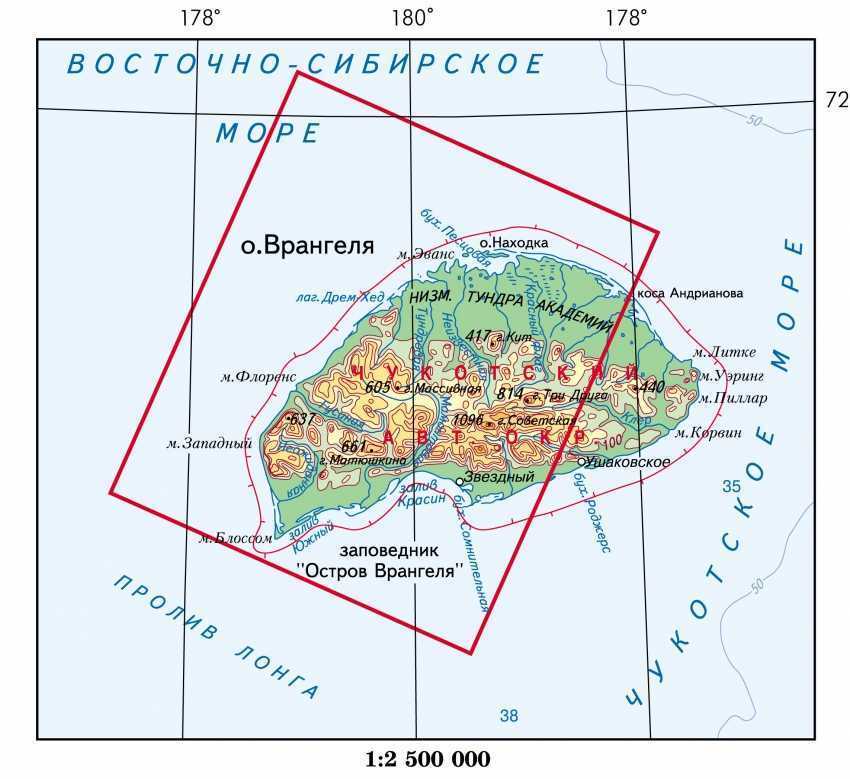 ООПТ лежит между Восточно-Сибирским и Чукотским морями, занимая площадь 2 225 655 гектар. 7 670 квадратных километров – один только остров, в честь которого ГЗ назван. Наибольший диаметр данного образования – 146 километров. Этот пятачок суши отделен от материка проливом Лонга, самая узкая часть которого равняется 140 километрам. Имеет два просторных залива (Красина и Южный). А также «форму печени». Административно это пространство относится к Иультинскому району Чукотского автономного округа. Охраняемая территория состоит не только из указанного объекта. Ее участком является и остров Геральд. Его размер – 11,3 квадратных километра. А еще разговор касается прилегающей акватории (1 430 000 квадратных километров). Она относится уже к Шмидтовскому району обозначенного АО, располагая мелкими островками. Вся представленная зона почти равняется африканскому государству Конго.