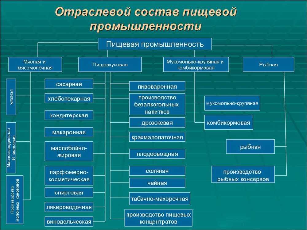 Большинство предприятий данного типа относятся к перерабатывающим отраслям. Лишь некоторые из них имеют добывающее направление (выпуск соли, рыбы и другие). Для качественной переработки первичного сырья каждый завод использует свои технологические схемы, но все они сводятся к тому, чтобы обеспечить высокую безопасность конечного продукта.