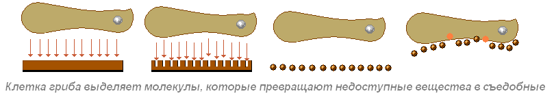 Грибы выделяют наружу вещества, разрывающие молекулы органических веществ на такие части, которые гриб может впитать.
