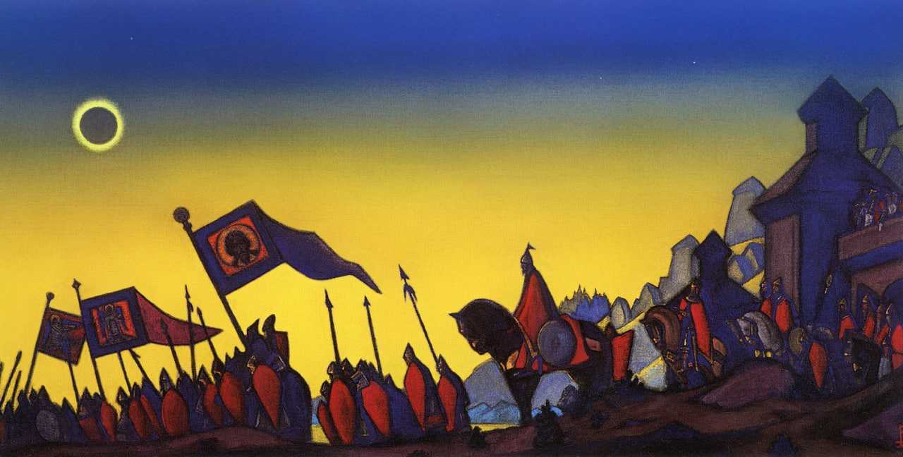 Солнечное затмение 1 мая 1185 года упоминается в «Слове о полку Игореве». Оно было расценено князем Игорем как предвестник беды. Сам князь и его дружина в тот момент наступали на половецкие земли и могли наблюдать только частичное затмение. Картина Николая Рериха «Поход Игоря», 1942 год.