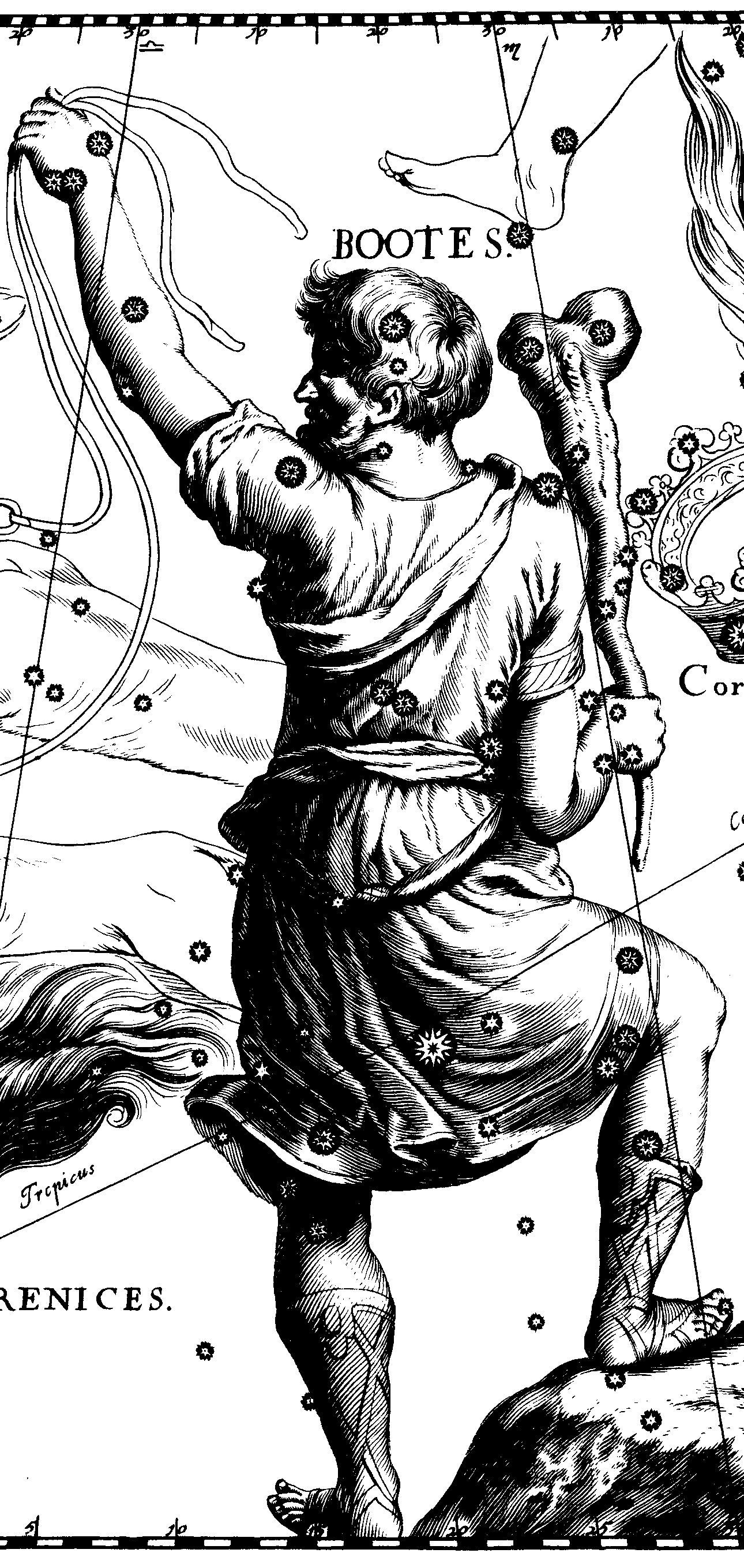 У многих созвездий есть легенды. Давным-давно у царя Ликаона, правившего страной Аркадией, была дочь по имени Каллисто. Красота ее была столь необыкновенной, что она рискнула соперничать с Герой – богиней и супругой всемогущего верховного бога Зевса. Ревнивая Гера отомстила Каллисто, превратив ее в безобразную медведицу. Когда сын Каллисто, юный Аркад, возвратившись с охоты, увидел у дверей своего дома дикого зверя, он, ничего не подозревая, чуть не убил свою мать-медведицу. Этому помешал Зевс: он удержал руку Аркада, а Каллисто навсегда взял к себе на небо, превратив в красивое созвездие – Большую Медведицу. Любимая собака Каллисто была превращена в Малую Медведицу. Не остался на Земле и Аркад: Зевс превратил его в созвездие Волопаса (рис. 18), обреченного навеки стеречь в небесах свою мать. Главная звезда этого созвездия называется Арктур, что означает «страж медведицы». Большая и Малая Медведицы являются незаходящими созвездиями, наиболее заметными на северном небе (рис. 16–17).