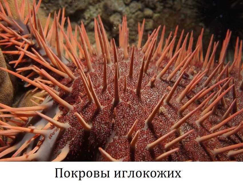 У иглокожих в подкожном слое находится биоминеральный эндоскелет. Он состоит из известковых пластинок, которые образуют своеобразные наружные покровы в виде игл, шипов, щипчиков.