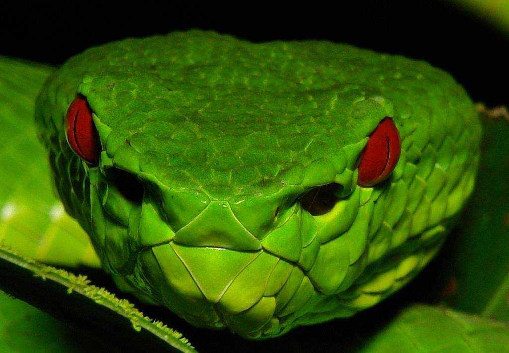 Шершавая древесная гадюка имеет кожу зеленого цвета и почти не выделяется на фоне зеленой листвы деревьев