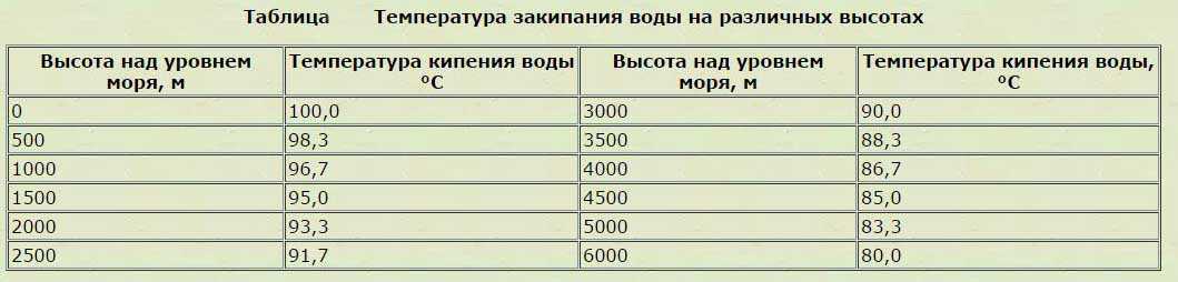 Кстати, чем меньше давление, тем ниже температура кипения воды. Поэтому на трех тысячах метрах вода закипает уже не при 100°С а при 90°С, а на шести тысячах — уже при 80°С.