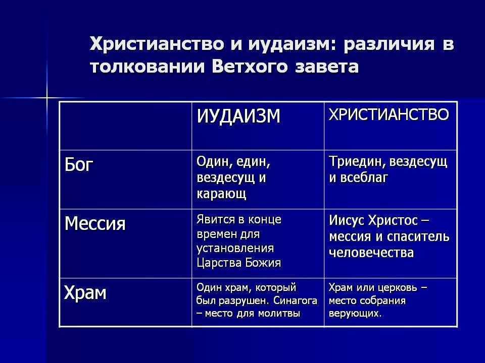 Что касается христианства, то тут выделяют два основных отличия. Во-первых, Бог в иудаизме не имел сына. Христос, по их убеждению, был обыкновенным смертным человеком, проповедником морали и благочестивого слова, последним пророком. Во-вторых, является национальной. То есть гражданин страны автоматически становится иудеем, не имея права впоследствии принять другое вероисповедание. в наше время — пережиток. Только в древние времена это явление процветало. Сегодня же оно почитается только евреями, сохраняя при этом идентичность и самобытность народа.