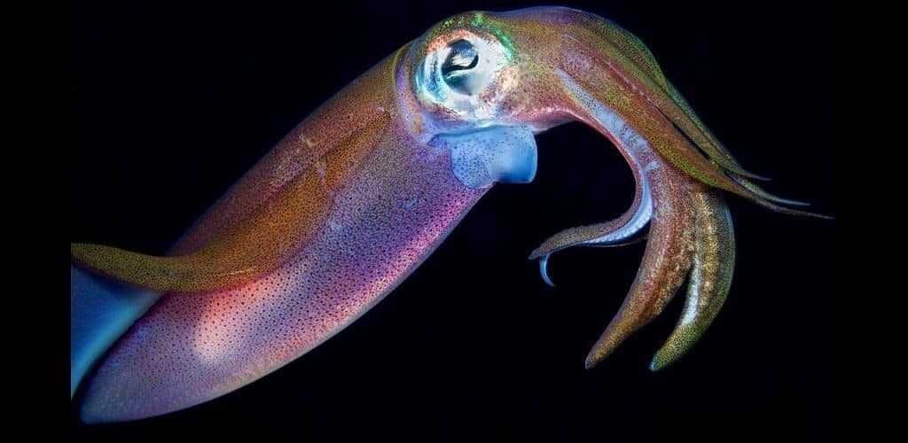 По строению тела кальмаров можно назвать близкими родственниками осьминогов и каракатиц. Оно подразделяется на голову и туловище, вокруг рта располагаются мускулистые щупальца – у кальмаров их десять. Щупальца снабжены присосками. В полости тела также расположен пузырь, наполненный жидкостью, которая легче воды. За счет этого создается нейтральная плавучесть – то есть кальмары не тонут даже при полной неподвижность. Дышат кальмары под водой при помощи жабр.