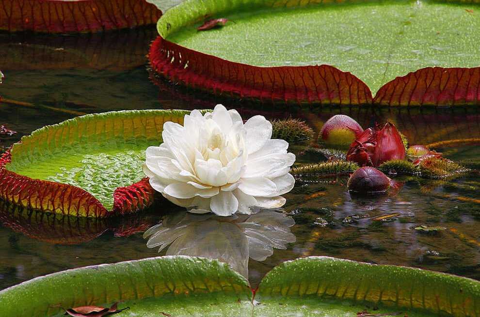 Оттенок, пожалуй, самого крупного цветка меняется в процессе цветения с белого на розовый. В распустившемся виде амазонская кувшинка может достигать 35 см. Виктория Регия обладает стойким, заметным ароматом, а ее листва может выдержать вес подростка.