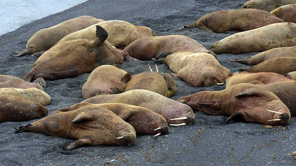 Летом моржи устраивают настоящие лежбища на отмелях или льдинах. Представьте себе несколько десятков огромных туш, каждая из которых весом более тонны, лежачих плотно друг к другу. Один морж облокотился бивнями об спину другого, второй закинул плавники на соседа, а третий решил искупаться и прёт по спинам «отдыхающих» к воде…