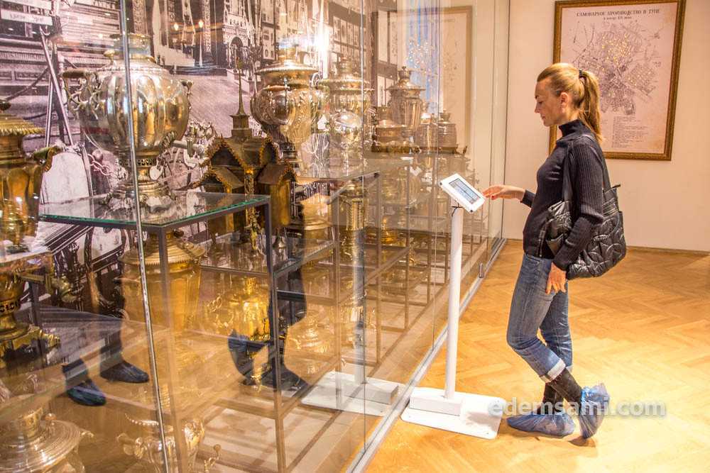 В основном зале есть информационные стойки для каждой витрины. С одной стороны, хорошо, потому что витрину не портят информационные таблички. Можно просто наслаждаться самоварами без всяких дополнительных раздражающих бумажек и табличек. С другой – не совсем удобно, потому что приходится бегать туда-сюда от витрины к стойке после каждого самовара.