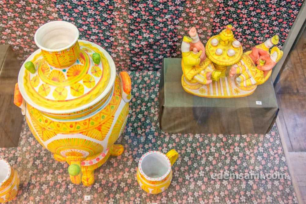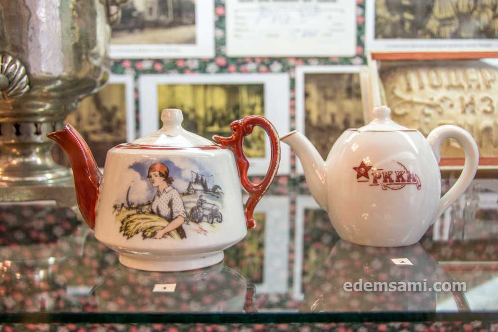 Экспозиция продолжается на втором этаже, где выставляются более современные самовары. Ну как современные – с конца 19 века и до конца 20. Атмосфера тут царит самая что ни на есть советская в лучшем смысле этого слова: веселенький ситчек в витринах, глянец самоварных боков.