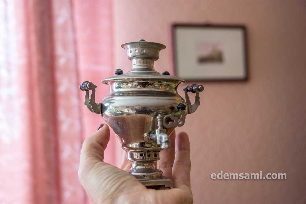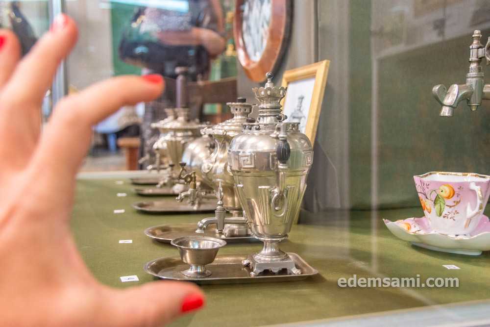 Заприметили одинокий старый самовар в витрине на переднем плане? Он непрост.