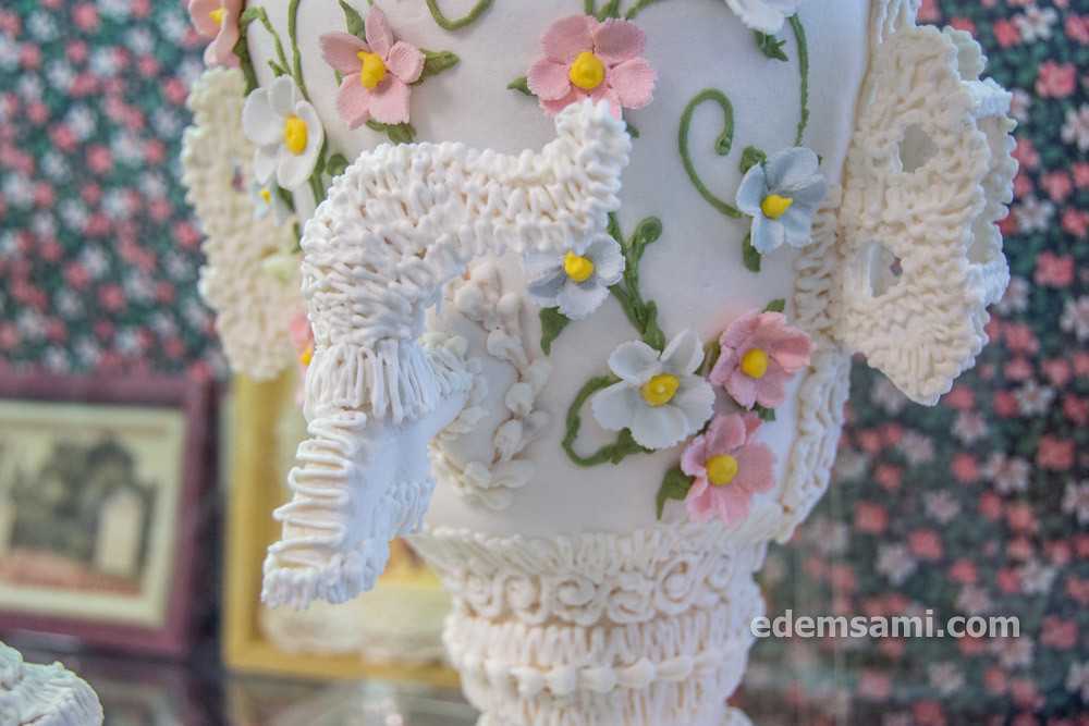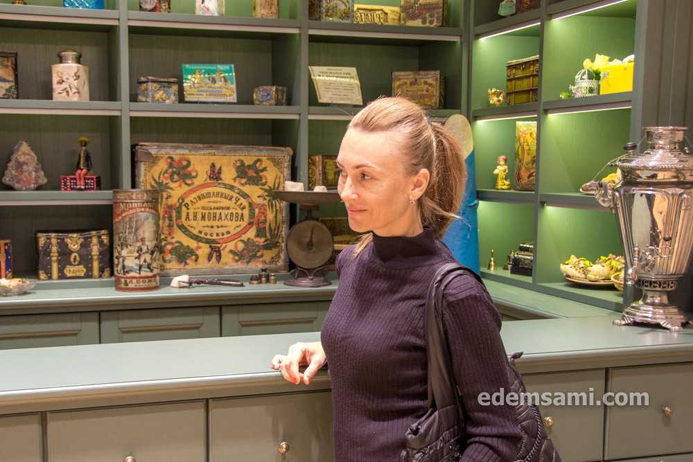 Рядом с основным залом на первом этаже есть небольшой дополнительный, где представлены всякие разные вещи, которые можно так или иначе отнести к процессу чаепития – от огромной сахарной головы и коробок с конфетами до ажурных вязаных скатертей и нарядов горожанок 19 века.